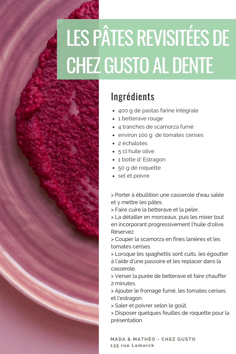 - les pâtes à la crème de betterave et à la scamorza fumée de Chez Gusto Al Dente