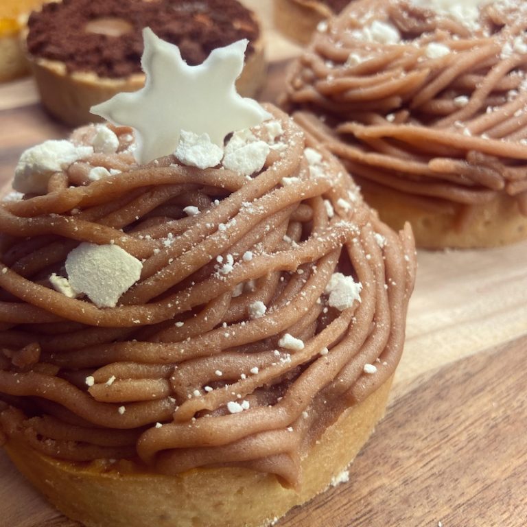La Bossue pense à ceux qui feront par exemple un petit réveillon en tête à tête, avec son incontournable tarte Mont Blanc : sur une délicieuse pâte sablée, retrouvez (dans le désordre) du confit de cassis, de la crème de marron, de la meringue, des éclats de marron, de la chantilly…
