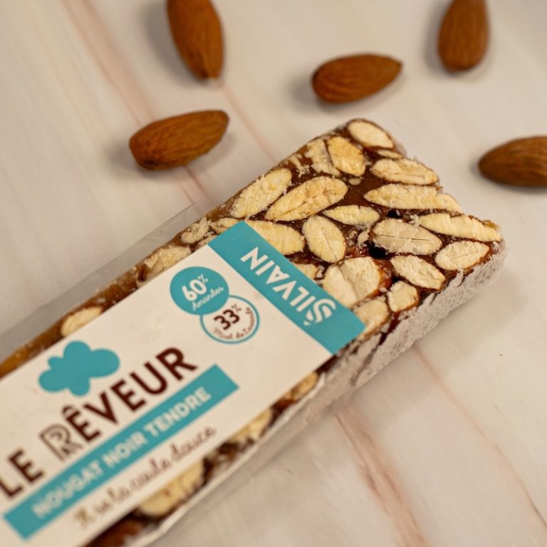 Parmi les 13 desserts provençaux, le nougat noir fait partie des piliers. Avec 60 % d’amandes et 33 % de miel de lavande, le nougat noir tendre Silvain est le mariage parfait du miel et des amandes. Tendre à souhait, il garde l’arôme naturel d’orange et la touche de cognac originelle des recettes de la famille.