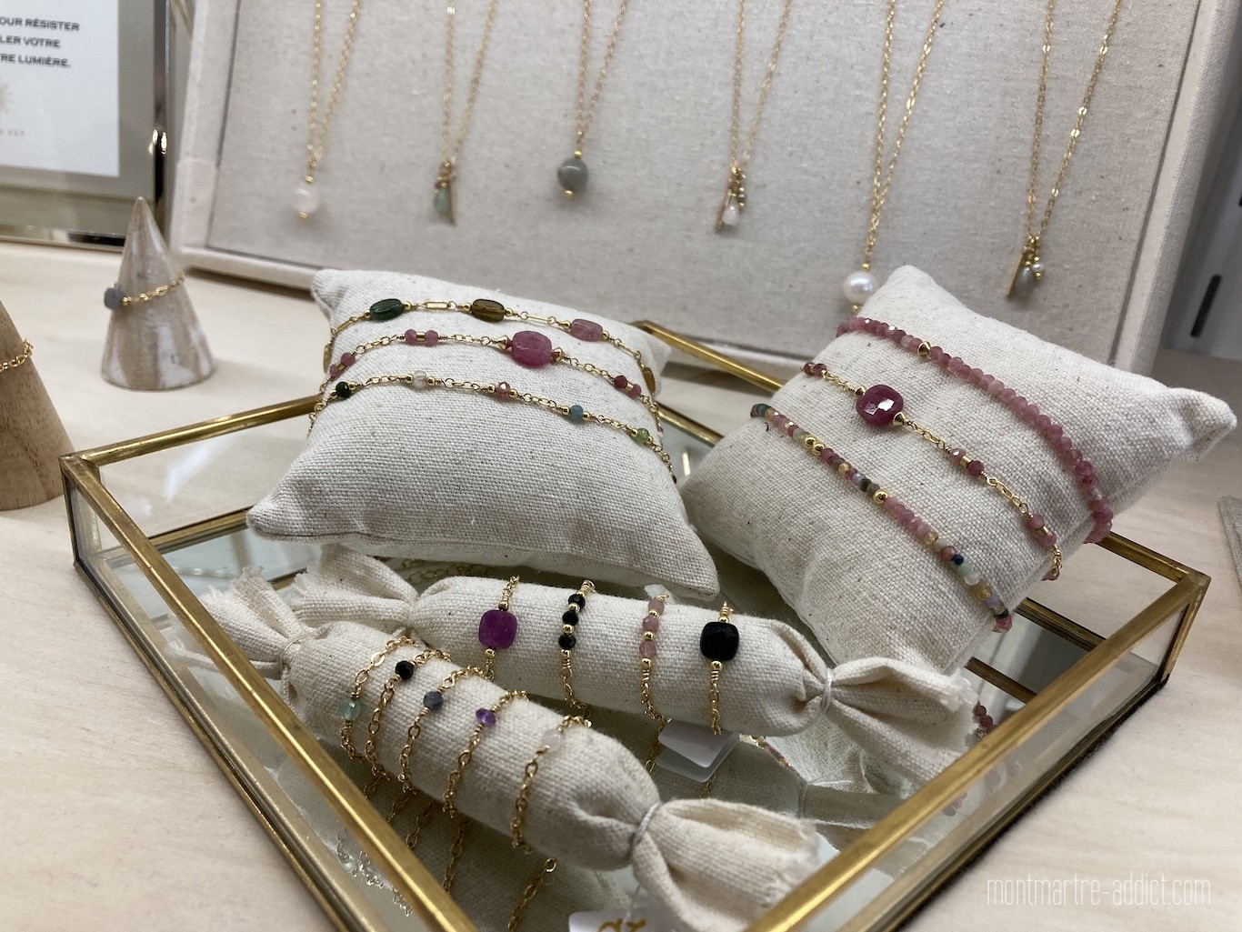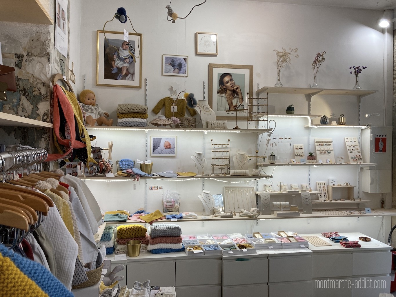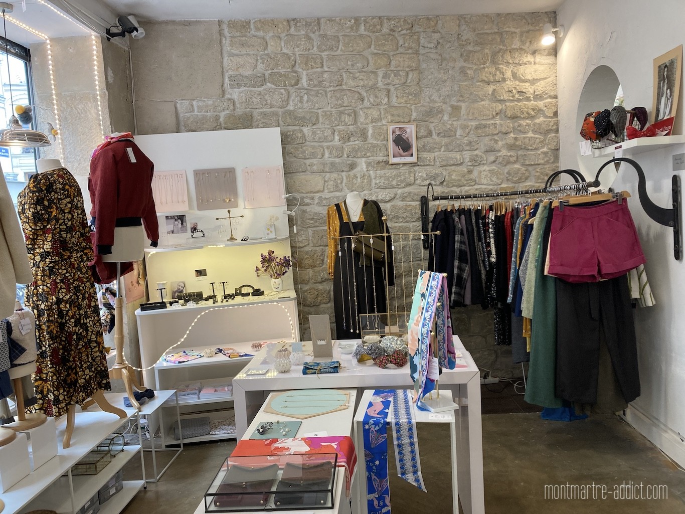 Côté bijoux et accessoires, on découvre le travail de Maï Martin et ses créations en cuir, Marianne Vey qui associe le pouvoir des pierres et la finesse des métaux précieux, les foulards de Virginie Riou, graphiste de formation et qui habite le quartier, et depuis quelques jours les sacs Ginès créés par Zoé dans son atelier parisien du quartier Bastille.