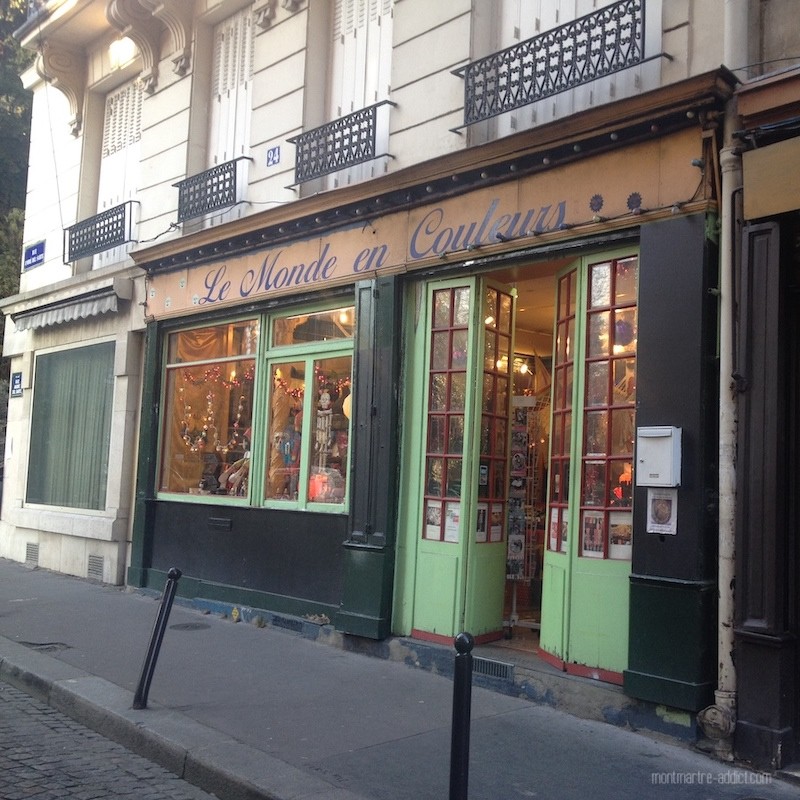 La rue n’a en soi rien d’extraordinaire, mais il s’en dégage une atmosphère étonnamment hors du temps. Sans doute est-ce dû en partie à la perspective sur les anciens magasins Dufayel d’un côté, et sur les rochers du Square Louise-Michel de l’autre. Entre les deux se succèdent petits immeubles et boutiques, ainsi que quelques restaurants. Au tout début de la rue côté Charles Nodier, c’est le No Problemo qui ouvre le bal. Repaire des habitués du quartier depuis des années, on y croise souvent les mêmes têtes, on s’y pose pour travailler autour d’un café, pour boire un verre ou pour déjeuner à la bonne franquette. Juste en face, Le Monde en Couleurs, boutique d’artisanat du monde entier, est tenue depuis plus de 25 ans par un ancien expatrié en Amérique du Sud. C’est là qu’on trouve les fameuses poupées mangeuses de chagrins, à glisser sous l’oreiller pour éloigner les mauvais rêves…