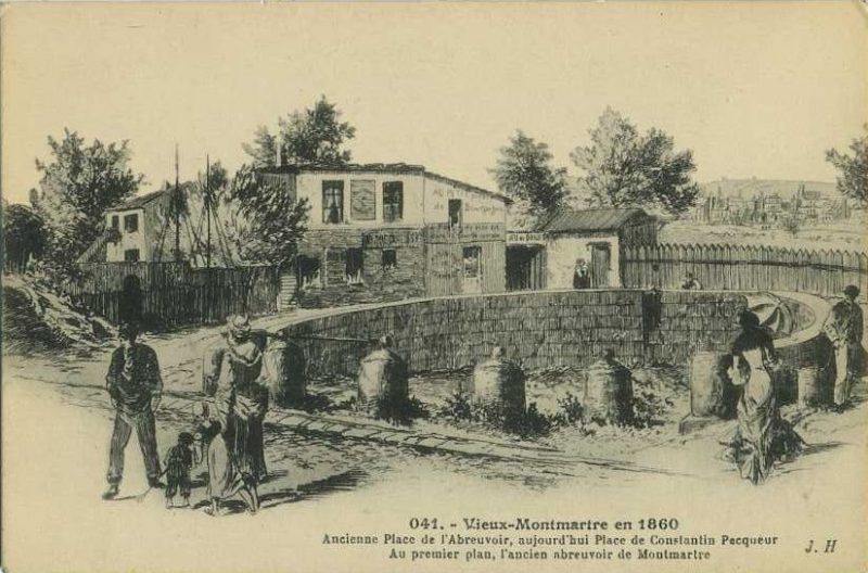Citée à partir de 1325 sous le nom de ruelle du Buc, ou « ruelle qui va au but », elle prend pour nom chemin (en 1843) puis rue de l’Abreuvoir en 1863. Elle suit en effet le tracé qui menait à la fontaine servant à l’approvisionnement en eau de la population et des animaux. Certaines sources indiquent que celle-ci se trouvait au bas de la rue Girardon au niveau de la Place Constantin Pecqueur, mais il semble plus probable que l’abreuvoir fut situé à l’angle de la rue Girardon, en face de l’actuelle Place Dalida. On en distingue encore d’ailleurs la cuvette pavée dont « la margelle (…) était faite avec une pierre tumulaire sur laquelle on distinguait l’image d’une abbesse tenant sa crosse en main. » (1) Gérard de Nerval l’évoque ainsi en 1854 : « Ce qui me séduisait avant tout dans ce petit espace abrité par les grands arbres du Château des Brouillards, c’était (…) le voisinage de l’abreuvoir, qui le soir s’anime du spectacle de chevaux et de chiens que l’on y baigne, et d’une fontaine construite dans le goût antique, où les laveuses causent et chantent comme dans un des premiers chapitres de Werther. » (2)