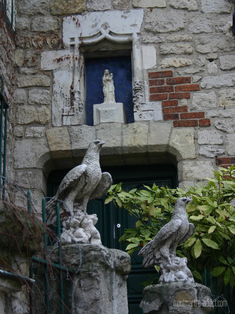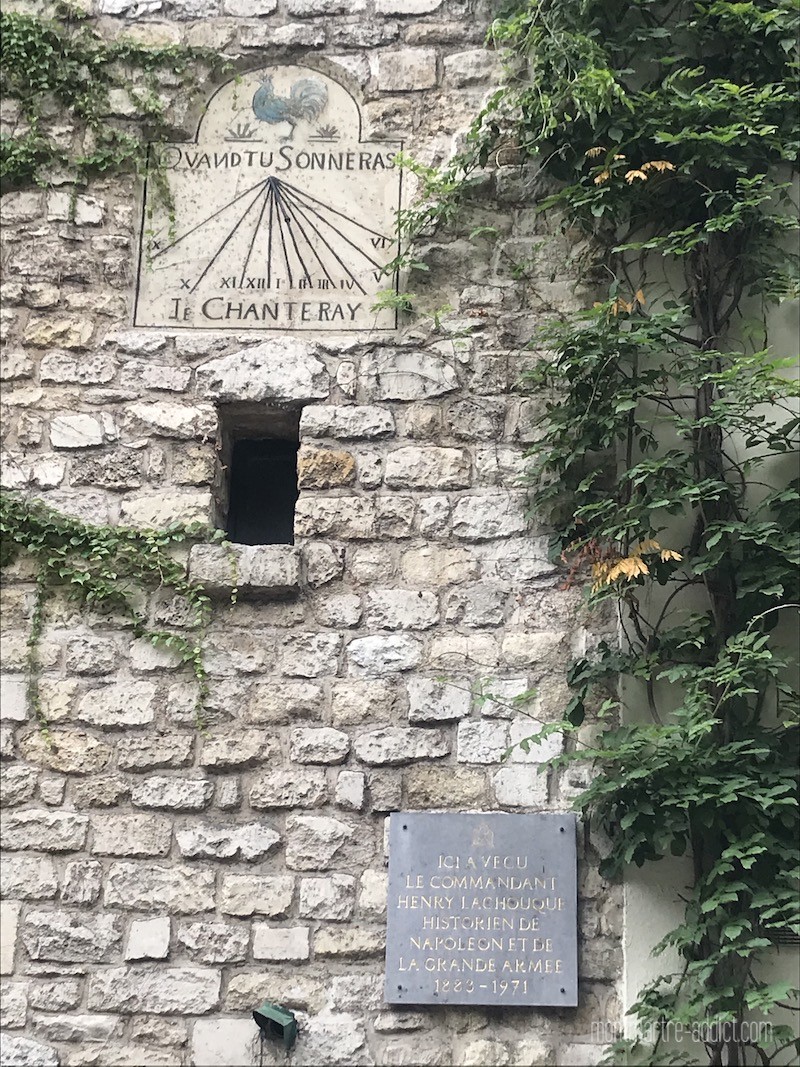 Le petit immeuble construit en 1883 au numéro 12 fut un temps l’adresse de Camille Pissaro qui y loua un pied-à-terre entre 1888 et 1892. On ne sait pas grand-chose des très jolies demeures jusqu’au numéro 6, l’autre maison rose de la rue, si ce n’est qu’elles ont énormément de charme, et que le peintre Georges Bottini y vécut. Et puis au numéro 4, on découvre la fameuse maison du Commandant Henry Lachouque, historien des campagnes de Napoléon. Le bâtiment est remarquable de par son architecture atypique, en pierres rehaussé de poutres apparentes, mais également grâce à sa décoration. On peut ainsi y voir des aigles en pierre (qui ont donné leur nom à la maison), une statuette de la Vierge Marie au fond d’une niche peinte en bleue figurant un ciel parsemé d’étoiles, mais surtout un cadran solaire sur lequel on peut lire la devise « Quand tu sonneras, je chanteray », à laquelle le Y final donne une allure ancienne alors que le cadran n’a été gravé qu’en 1924, année de construction de la maison. Quant au N à l’envers dans le mot « quand », il s’agit certainement d’un clin d’œil à l’alphabet cyrillique.