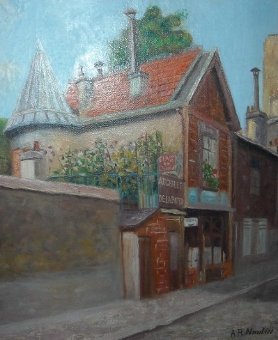 Un peu plus loin au numéro 5, impossible de ne pas tomber sous le charme de la petite maison en briques rouges, vestige de l’exposition universelle de 1889, où Georges Courteline vécut quelques années avant de s’installer rue Lepic (certainement au début des années 1890). L’auteur de théâtre aimait tellement Montmartre qu’il prétendait y être né (alors qu’il était tourangeau), mais ses grands-parents possédaient effectivement une maison de vacances au 40 rue du Chevalier de la Barre (ancienne rue Fontenelle) où il passait tous ses étés. Un tableau signé A.R. Noulin (mais non daté) représente la maison qui semble alors être un bistrot dénommé Le Chalet de la Butte.