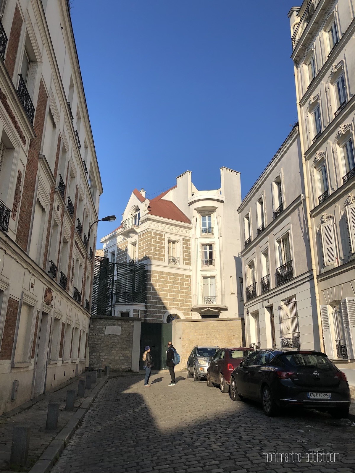 Un peu plus loin au numéro 5, impossible de ne pas tomber sous le charme de la petite maison en briques rouges, vestige de l’exposition universelle de 1889, où Georges Courteline vécut quelques années avant de s’installer rue Lepic (certainement au début des années 1890). L’auteur de théâtre aimait tellement Montmartre qu’il prétendait y être né (alors qu’il était tourangeau), mais ses grands-parents possédaient effectivement une maison de vacances au 40 rue du Chevalier de la Barre (ancienne rue Fontenelle) où il passait tous ses étés. Un tableau signé A.R. Noulin (mais non daté) représente la maison qui semble alors être un bistrot dénommé Le Chalet de la Butte.