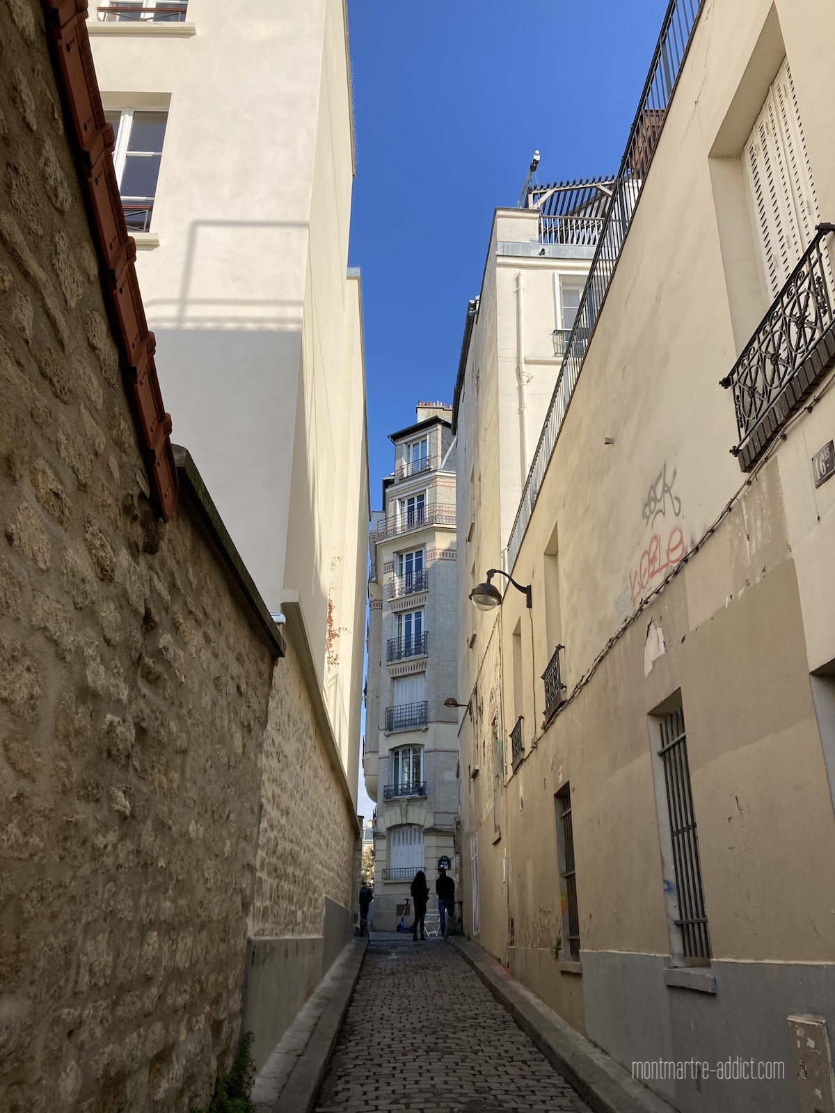 La rue, longue de 136 mètres et large de 3, forme au niveau du 11 bis un coude à angle droit, et cette portion jusqu’à la rue Lepic accueille le plus petit trottoir de Paris. C’est là que Romain Duris et Audrey Tautou s’embrassent pour la première fois dans L’Auberge Espagnole de Romain Duris. Par contre, ne cherchez pas le 75 bis, il n’existe pas, même si Marcel Aymé y fait résider le fameux Monsieur Dutilleul, héros du Passe-Muraille. Dernière anecdote : selon la liste officielle des bombes d’avions et de zeppelins lancées sur Paris et la banlieue durant la première guerre mondiale, la rue aurait été bombardée par un raid allemand le 2 septembre 1914.