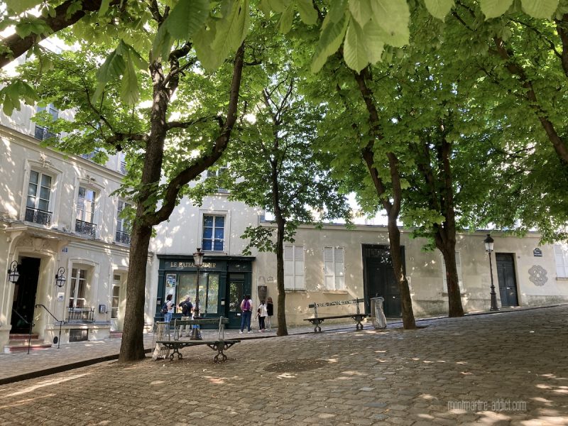 L’une des particularités de la rue Ravignan est, comme on l’a dit, d’être traversée par la Place Emile Goudeau, qui ne prit ce nom qu’en 1911. Mais la place fait bien partie de la rue, et c’est donc rue Ravignan qu’était situé Le Poirier Sans Pareil, célèbre guinguette dont le jardin abritait un poirier si grand qu’une table pouvant accueillir une douzaine de personnes avait été installée dans ses branches. C’est donc aussi rue Ravignan que se situait l’ancienne manufacture de pianos transformée en ateliers d’artistes baptisée Le Bateau Lavoir par Max Jacob. En face au N°16, l’Hôtel du Poirier, hommage à l’arbre du même nom, hébergea entre autres Modigliani, Pierre Mac-Orlan, et Albert Camus qui y acheva le premier brouillon de son roman L’Etranger. Un autre hôtel au N°11, le Grand Hôtel Goudeau, servit de point de chute au résistant Roger Vailland durant l’occupation, qui porte aujourd’hui le nom de Tim Hôtel.
