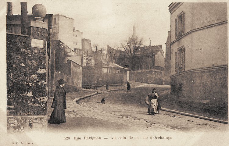 Tracée au 14e siècle, la rue Ravignan, qui reliait Paris au village de Montmartre, portait alors le nom de Chemin Sacalie, où se trouvait également une vigne du même nom. Elle prit ensuite le nom de Chemin Vieux puis rue du Vieux Chemin de Paris, avant d’être rebaptisée en 1867 rue Ravignan. Surnommé « l’apôtre de Paris », Gustave de Lacroix de Ravignan fut d’abord substitut au Barreau de Paris avant de rejoindre les Jésuites où il devint prédicateur ; l’histoire ne dit pas pourquoi la rue porte son nom. Ce que l’on sait en revanche, c’est que depuis la rue des Abbesses, elle grimpait tout droit vers la rue Norvins en direction de l’Eglise Saint-Pierre, avant d’être amputée de sa partie haute entre les rues Gabrielle et Norvins. On se souvient également qu’elle fut empruntée en 1809 par Napoléon.