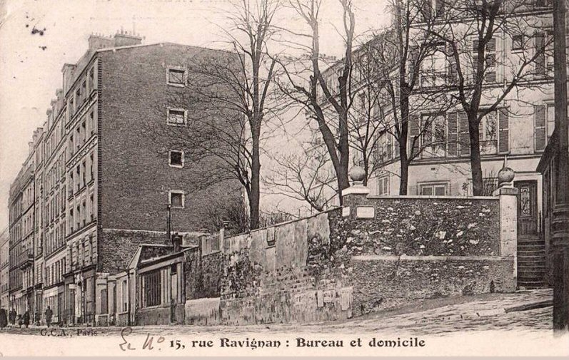 L’une des particularités de la rue Ravignan est, comme on l’a dit, d’être traversée par la Place Emile Goudeau, qui ne prit ce nom qu’en 1911. Mais la place fait bien partie de la rue, et c’est donc rue Ravignan qu’était situé Le Poirier Sans Pareil, célèbre guinguette dont le jardin abritait un poirier si grand qu’une table pouvant accueillir une douzaine de personnes avait été installée dans ses branches. C’est donc aussi rue Ravignan que se situait l’ancienne manufacture de pianos transformée en ateliers d’artistes baptisée Le Bateau Lavoir par Max Jacob. En face au N°16, l’Hôtel du Poirier, hommage à l’arbre du même nom, hébergea entre autres Modigliani, Pierre Mac-Orlan, et Albert Camus qui y acheva le premier brouillon de son roman L’Etranger. Un autre hôtel au N°11, le Grand Hôtel Goudeau, servit de point de chute au résistant Roger Vailland durant l’occupation, qui porte aujourd’hui le nom de Tim Hôtel.