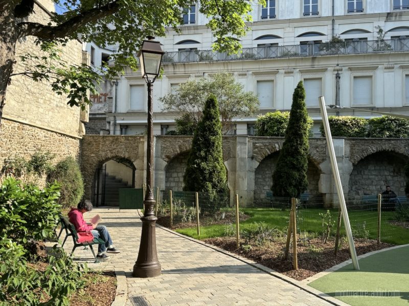 Une allée centrale a ainsi été créée, permettant une circulation beaucoup plus fluide entre les touristes qui se rendent au Mur des Je t’Aime et les “locaux” qui peuvent désormais accéder directement au fond du square et à la nouvelle aire de jeux pour les enfants. Celle-ci, beaucoup plus grande que la précédente, est revêtue d’un sol souple et est abritée par une grande voile d’ombrage. Grâce aux nombreux bancs installés tout autour, les parents profitent de l’espace en toute quiétude, ainsi que de la pelouse également plantée dans cette zone près des arcades, invitant à la détente et au calme.