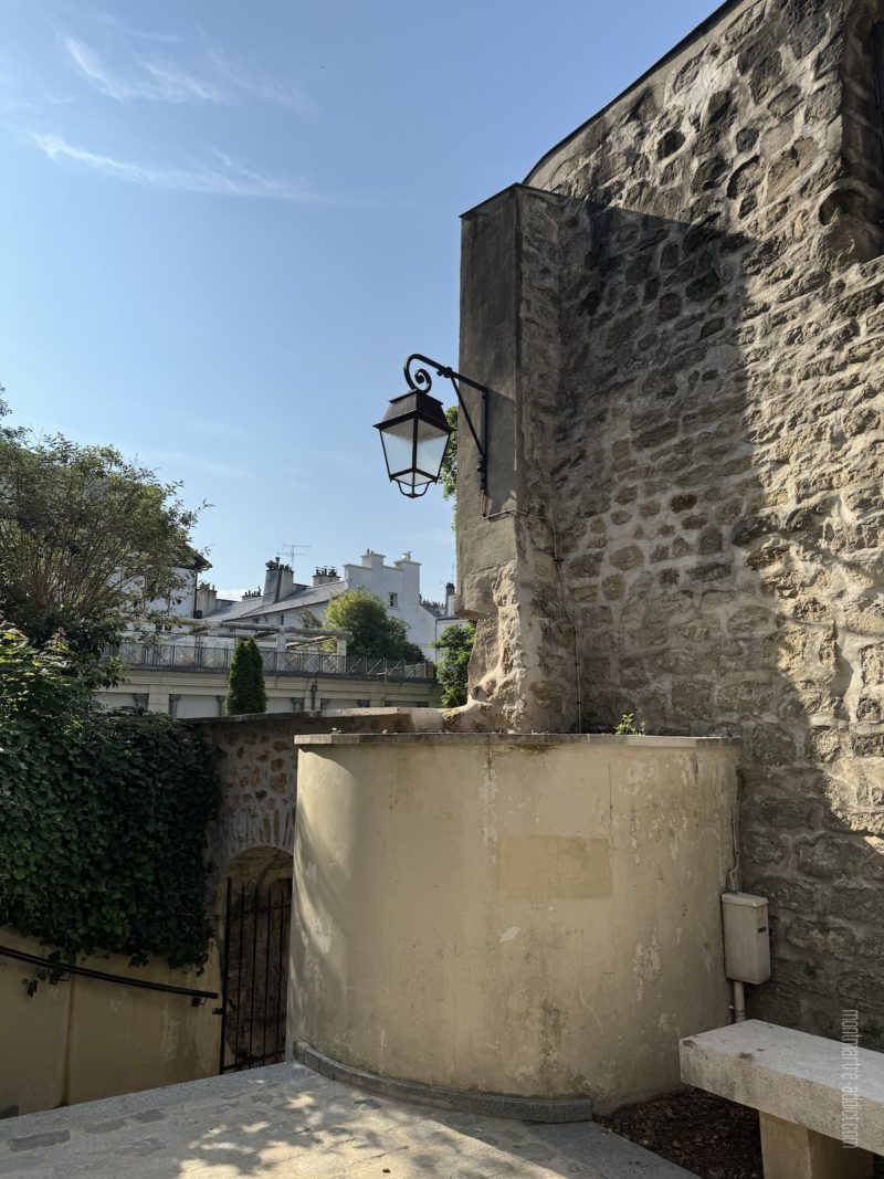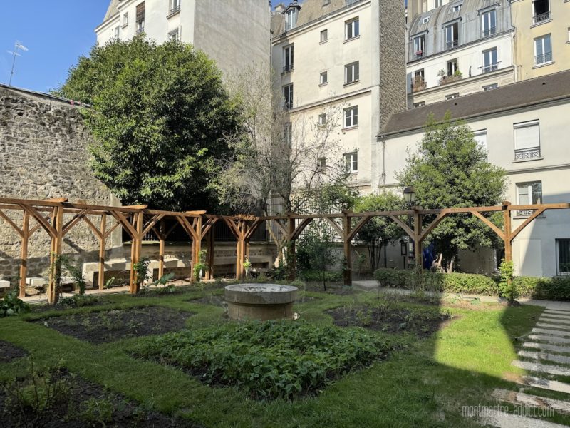 Mais le clou du spectacle se situe tout au fond, après les quelques marches qui mènent au Jardin des Abbesses, fermé depuis de trop longues années pour raisons de sécurité. Ce jardin, qui évoque ceux de l’ancienne Abbaye de Montmartre, abrite de nombreuses fleurs et plantes médicinales comme la sauge, la verveine, le romarin et autres simples, utilisées jadis pour soigner, et dispose de bancs en pierre qui permettent de profiter du lieu à l’abri de l’agitation du quartier. Des grimpantes ont été plantées autour d’une nouvelle pergola, tandis que les murs autour du jardin ainsi que l’entrée côté Passage des Abbesses ont été entièrement rénovés. Il est également prévu que la fontaine centrale soit aussi remise en eau. Pour peu que le soleil soit au rendez-vous, on se croirait volontiers transporté au bord de la Méditerranée.