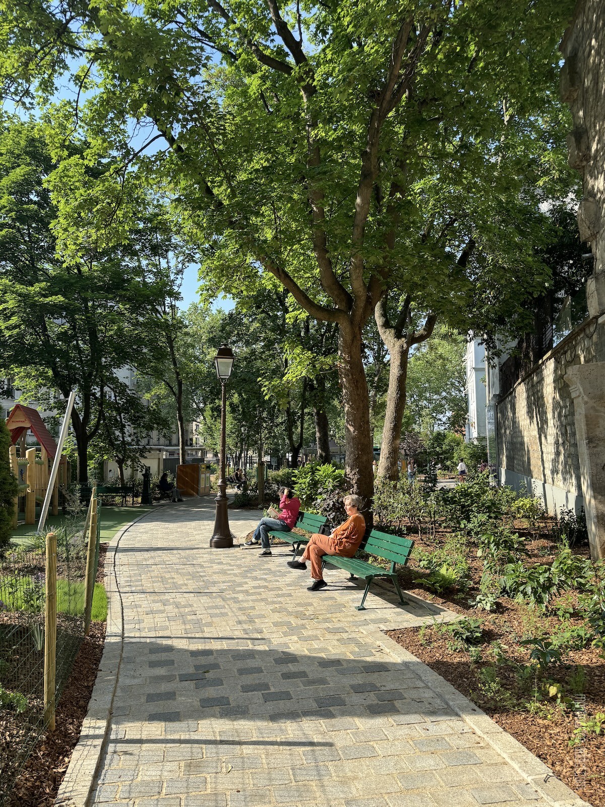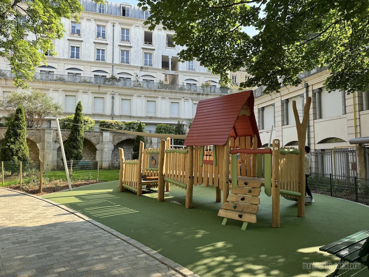Une allée centrale a ainsi été créée, permettant une circulation beaucoup plus fluide entre les touristes qui se rendent au Mur des Je t’Aime et les “locaux” qui peuvent désormais accéder directement au fond du square et à la nouvelle aire de jeux pour les enfants. Celle-ci, beaucoup plus grande que la précédente, est revêtue d’un sol souple et est abritée par une grande voile d’ombrage. Grâce aux nombreux bancs installés tout autour, les parents profitent de l’espace en toute quiétude, ainsi que de la pelouse également plantée dans cette zone près des arcades, invitant à la détente et au calme.