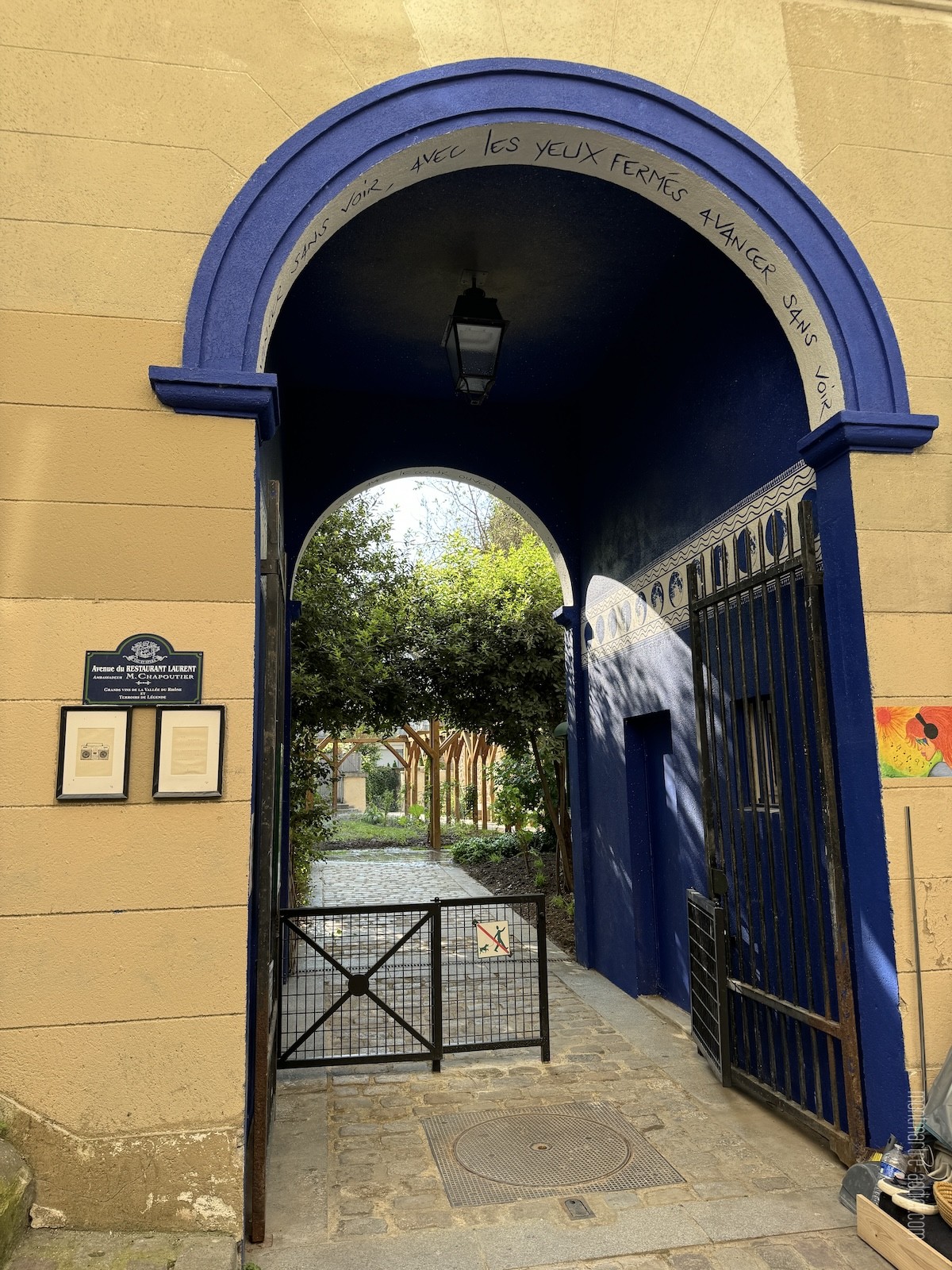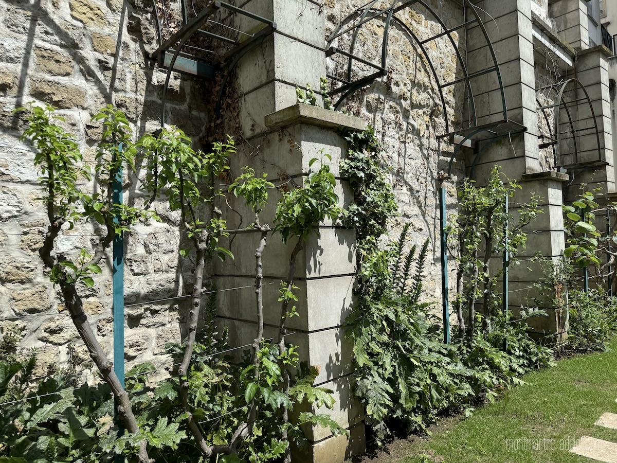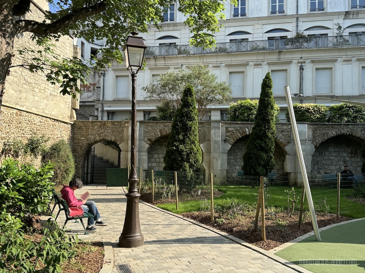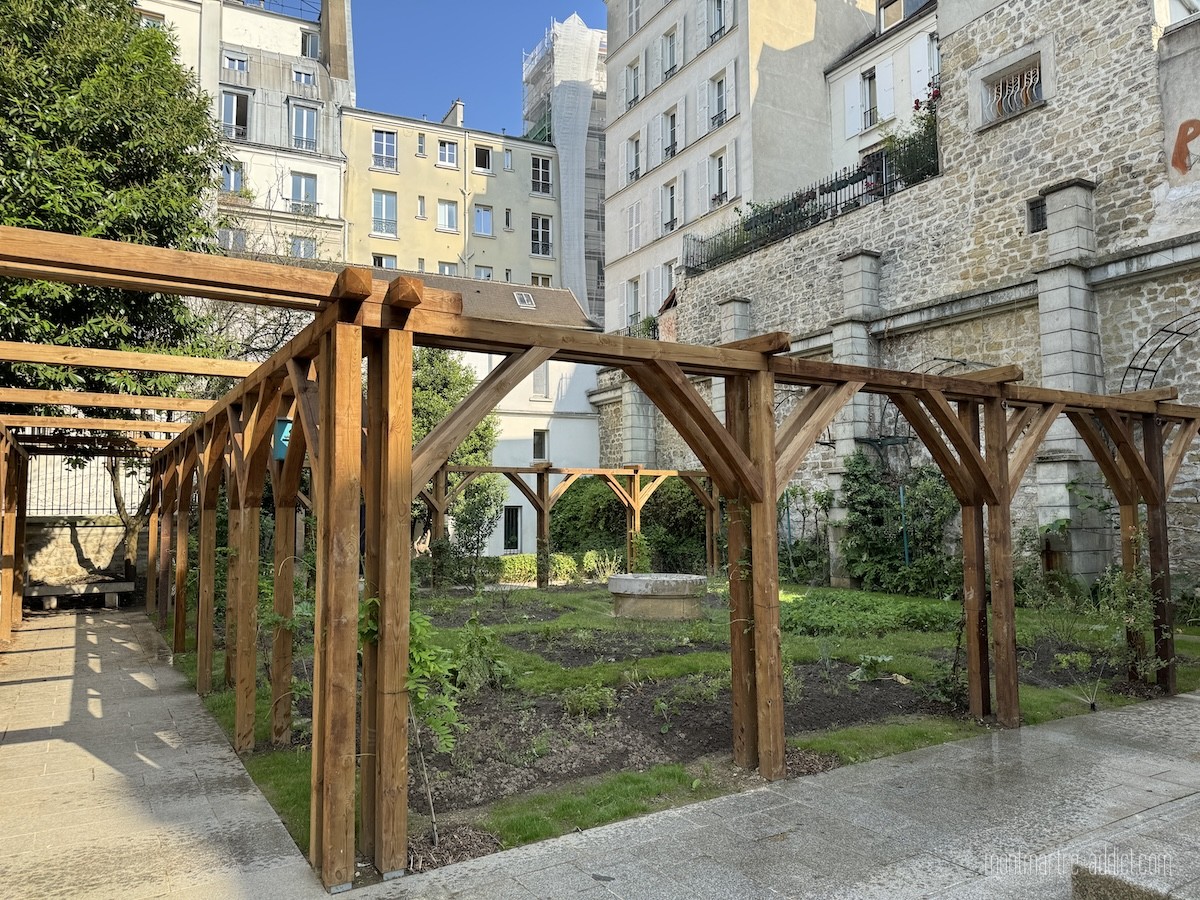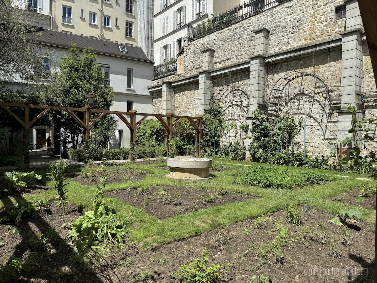 Mais le clou du spectacle se situe tout au fond, après les quelques marches qui mènent au Jardin des Abbesses, fermé depuis de trop longues années pour raisons de sécurité. Ce jardin, qui évoque ceux de l’ancienne Abbaye de Montmartre, abrite de nombreuses fleurs et plantes médicinales comme la sauge, la verveine, le romarin et autres simples, utilisées jadis pour soigner, et dispose de bancs en pierre qui permettent de profiter du lieu à l’abri de l’agitation du quartier. Des grimpantes ont été plantées autour d’une nouvelle pergola, tandis que les murs autour du jardin ainsi que l’entrée côté Passage des Abbesses ont été entièrement rénovés. Il est également prévu que la fontaine centrale soit aussi remise en eau. Pour peu que le soleil soit au rendez-vous, on se croirait volontiers transporté au bord de la Méditerranée.