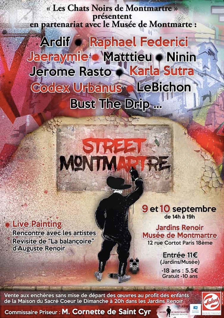 L’identité culturelle du quartier de Montmartre est l’une des sources du mouvement d’art urbain actuel. L’événement STREET montmARTre se veut à l’image de cette pratique de l’art urbain. Il ne s’agit pas de faire entrer un artiste en particulier dans le musée mais bien davantage de confronter plusieurs visions dans un espace unique. De la même façon que de nombreux artistes ont cohabité au Musée de Montmartre, l’événement propose à une dizaine d’artistes de street art de cohabiter dans cet espace le temps d’un week-end et d’y réinterpréter la création impressionniste et avant-gardiste de l’époque. En proposant un dialogue entre ces deux courants, semble-t-il si éloignés, le musée – ancien lieu de résidence et de rencontre – pose la question de la postérité et de la transmission.