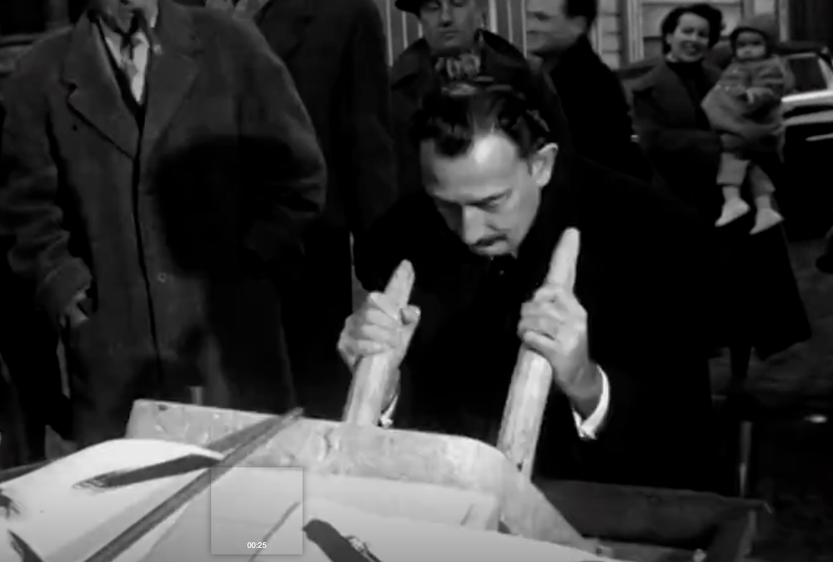 Il faudra ensuite attendre 1956 pour retrouver Dalì à Montmartre, année durant laquelle le peintre démarre l’illustration d’une nouvelle édition du Don Quichotte de Cervantès. Certainement inspiré par les moulins de la Butte, l’artiste, en génie du marketing, convoque la presse en haut de l’avenue Junot, à deux pas du Moulin de la Galette, pour assister en direct à la création de la première estampe. La mise en scène est digne d’un film, avec un Don Quichotte remontant la rue Girardon à cheval, et un Dalì peignant une première planche avec deux cornes de rhinocéros trempées dans de la mie de pain imbibée d’encre !