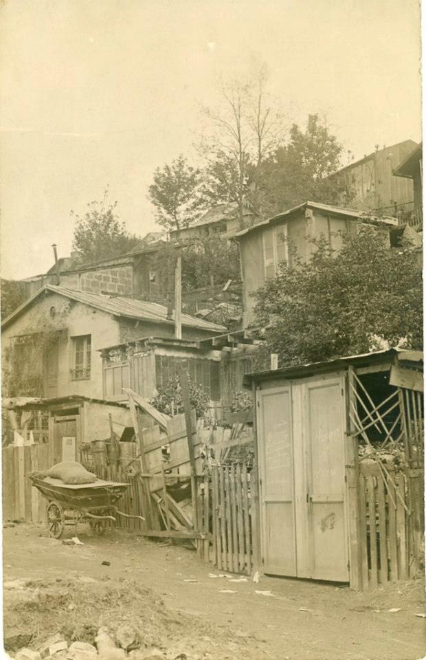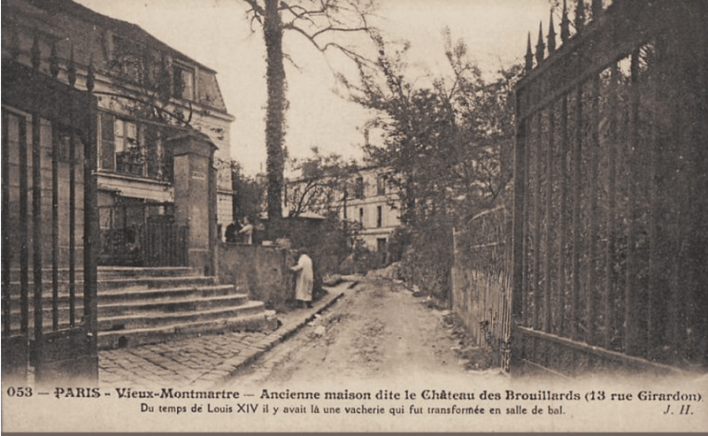 Le Château des Brouillards était au bout de la rue Girardon, en équilibre instable au bord du plateau glaiseux. (…) Une haie entourait le domaine composé de plusieurs bâtiments et d’un jardin. (…) Le long de notre barricade, il y avait des rosiers retournés à l’état sauvage. (…) Il y avait aussi un pré avec des vaches. (…) Pour les Parisiens, ce petit paradis de lilas et de roses semblait le bout du monde. Les cochers refusaient d’y monter, arrêtant leur fiacre soit à la Place de la Fontaine-du-But, et alors il s’agissait de grimper le talus pour arriver à la maison, soit même rue des Abbesses…
