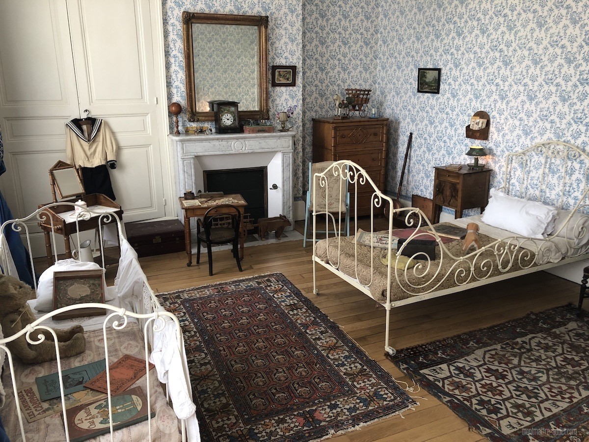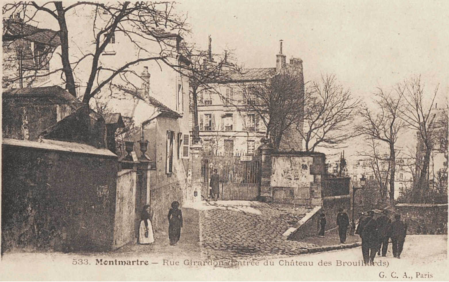 Le Château des Brouillards était au bout de la rue Girardon, en équilibre instable au bord du plateau glaiseux. (…) Une haie entourait le domaine composé de plusieurs bâtiments et d’un jardin. (…) Le long de notre barricade, il y avait des rosiers retournés à l’état sauvage. (…) Il y avait aussi un pré avec des vaches. (…) Pour les Parisiens, ce petit paradis de lilas et de roses semblait le bout du monde. Les cochers refusaient d’y monter, arrêtant leur fiacre soit à la Place de la Fontaine-du-But, et alors il s’agissait de grimper le talus pour arriver à la maison, soit même rue des Abbesses…