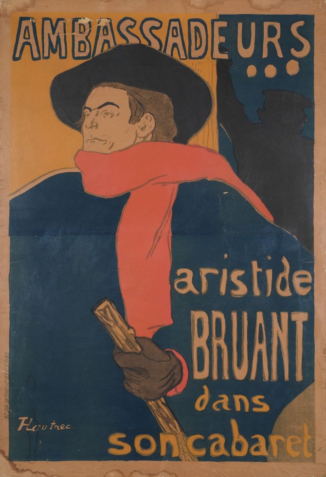 Mais c’est surtout dans le Bas Montmartre que l’on verra le plus souvent Lautrec, celui-ci fréquentant nombre de cabarets à commencer par Le Mirliton, tenu par son ami Aristide Bruant, et situé au 81 bd de Rochechouart, à l’emplacement du premier Chat Noir. Il s’y rend régulièrement à l’invitation du chansonnier, qui en accrochera quelques toiles aux murs de son cabaret. Lautrec réalisera également plusieurs affiches, qui forgeront l’image picturale de Bruant, jusqu’à celle du Concert des Ambassadeurs, dont Bruant exigea que tout Paris en soit recouvert sous peine de ne pas chanter !