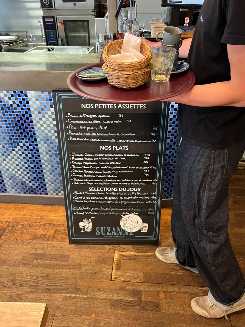 Parfaitement ancré dans la vie du quartier, Suzanne est ouvert tous les jours en service continu de 8h à 23h. Le matin, on peut y prendre un petit-déjeuner traditionnel (boisson chaude, jus de fruits frais et tartine ou viennoiseries), avant que la cuisine, ouverte sur la salle, ouvre à partir de midi et ce en service continu jusqu’au soir ; bon à savoir quand on n’a pas eu le temps de déjeuner le midi et que nos estomacs savent qu’ils ne pourront pas attendre l’heure du diner !