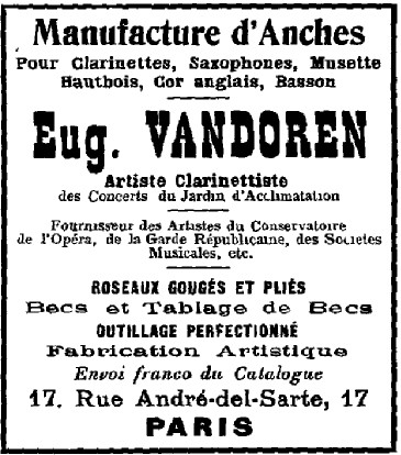 Tout commence ainsi en 1905. Eugène Van Doren, clarinettiste à l’Opéra de Paris, fabrique lui-même ses propres anches, petits morceaux de roseau fixés grâce à une ligature sur le bec de l’instrument et indispensables à sa pratique. L’homme est habile, et ses anches « sonnent » si bien que ses collègues apprécient lorsqu’il accepte de leur en céder quelques-unes. Mais le travail est long et fastidieux, et Eugène, aussi doué de ses mains que pour la mécanique, conçoit, dans son appartement de la rue André Del Sarte, une machine actionnée au pied comme une machine à coudre qui lui permet de gagner du temps. Ces anches ont tout de suite beaucoup de succès et, l’année de la naissance de son fils Robert, il fonde, au 17 rue André del Sarte, une fabrique d’anches qui lui prendra désormais plus de temps que la pratique de la clarinette !