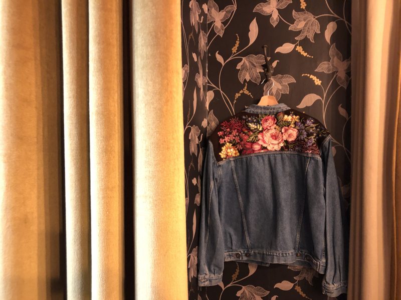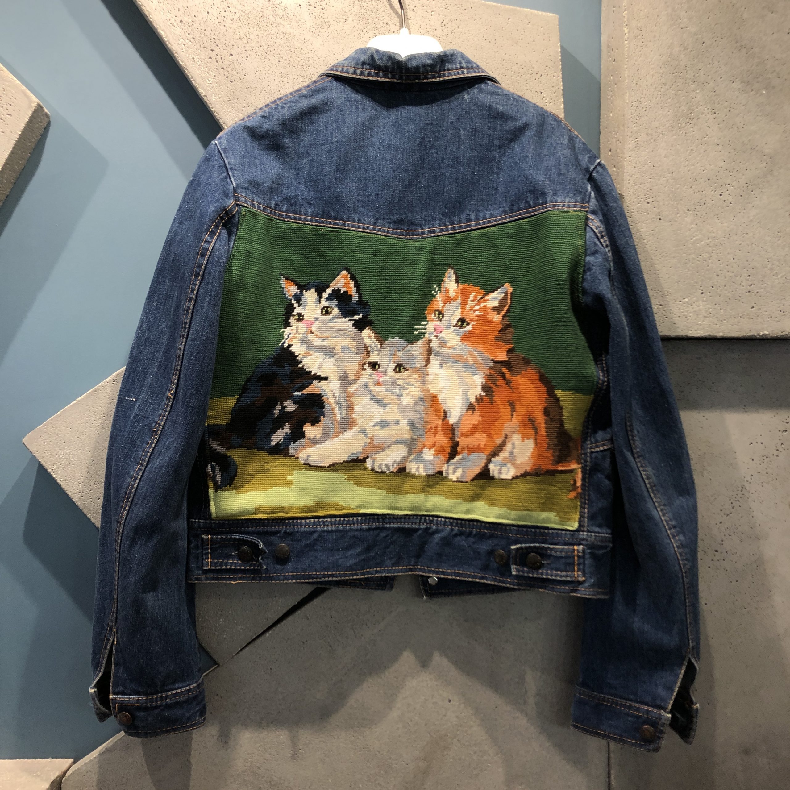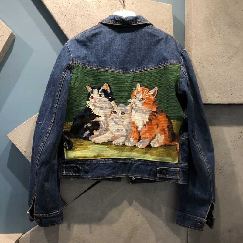✨ Les vestes en jean chinées et leurs motifs en canevas cousus de la créatrice Claire Hudelaine.