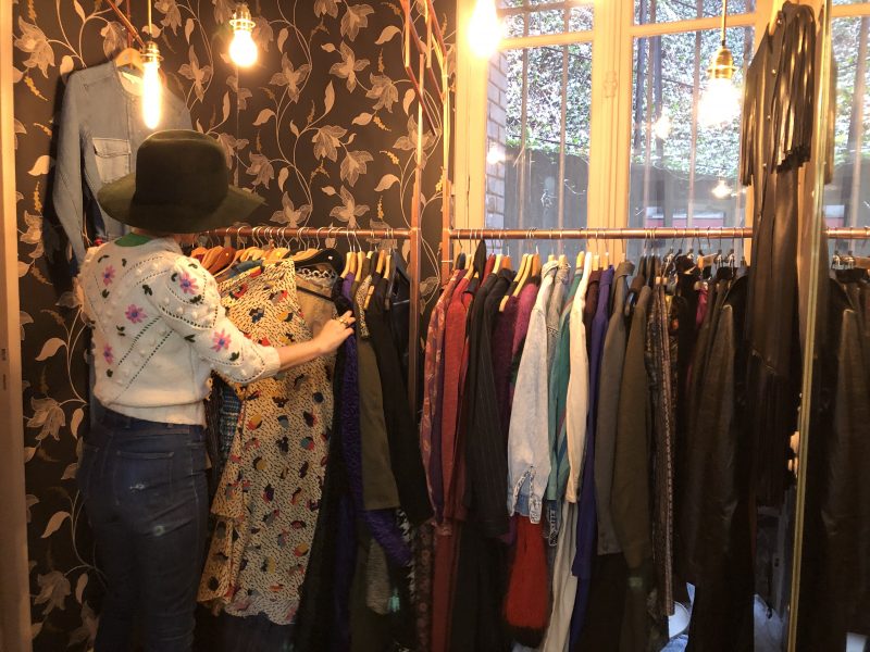 Au fond de la boutique, un corner vintage est le repaire des fashionistas du quartier. Des dizaines de pièces s’entremêlent, notamment de seconde-main. Véritable capsule des années 80 et voyage dans le temps, on y trouve une sélection pointue des grands designers de l’époque : Mugler, Véronique Leroy ou encore Diane Von Furstenberg mais aussi du Prada ou du Dior. Le fil conducteur ? Les années Palace et la fête avant tout. Paillettes, couleurs flashy et coupes qui cassent les codes : Catherine craque pour des pièces fortes, portées par des femmes qui assument. Chic et excentrisme vont de pair, ce qu’il faut avant tout, c’est ne pas avoir peur d’oser ! Monomaniaque des combinaisons-pantalons, elle nous présente avec un brin d’autodérision les nombreuses salopettes en coton, laine ou denim qui ont chacune le droit à une histoire, un mot doux ou une anecdote.