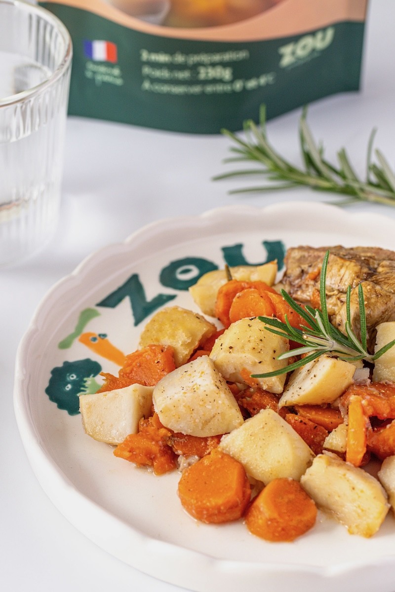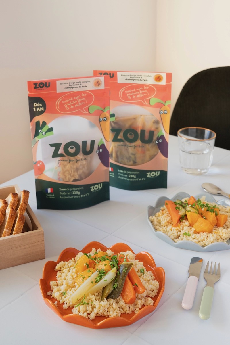 L’offre de Zou s’adresse aux enfants à partir d’un an environ, lorsque l’apprentissage de la mastication commence. Tous les plats contiennent ainsi de vrais morceaux, contrairement à l’offre classique de petits pots et autres plats issus de l’industrie agro-alimentaire. Chaque recette, élaborée par un chef, est conçue pour répondre aux besoins nutritionnels de cette tranche d’âge, et peut convenir jusqu’à 6 ans environ, les portions étant particulièrement généreuses. Chez Zou, on n’utilise que des produits bruts, sans sel ni aucun additif, et l’accent est mis sur la diversité des ingrédients et l’utilisation des épices pour développer le goût.