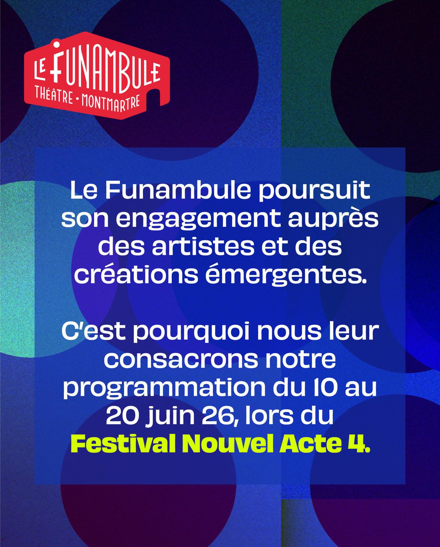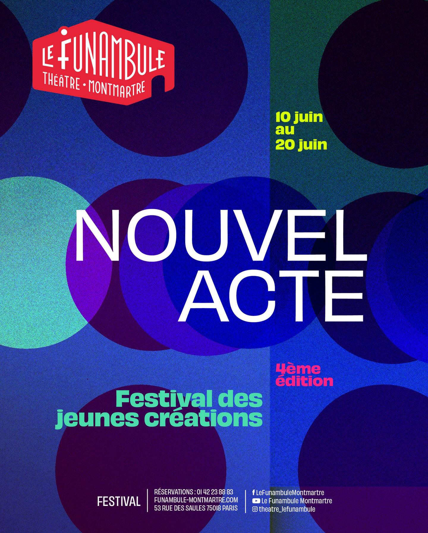 Nous avons donc le plaisir de vous proposer une nouvelle édition du Festival Nouvel Acte. Nous consacrons notre programmation du 10 au 20 juin 2026 aux spectacles de jeunes compagnies.