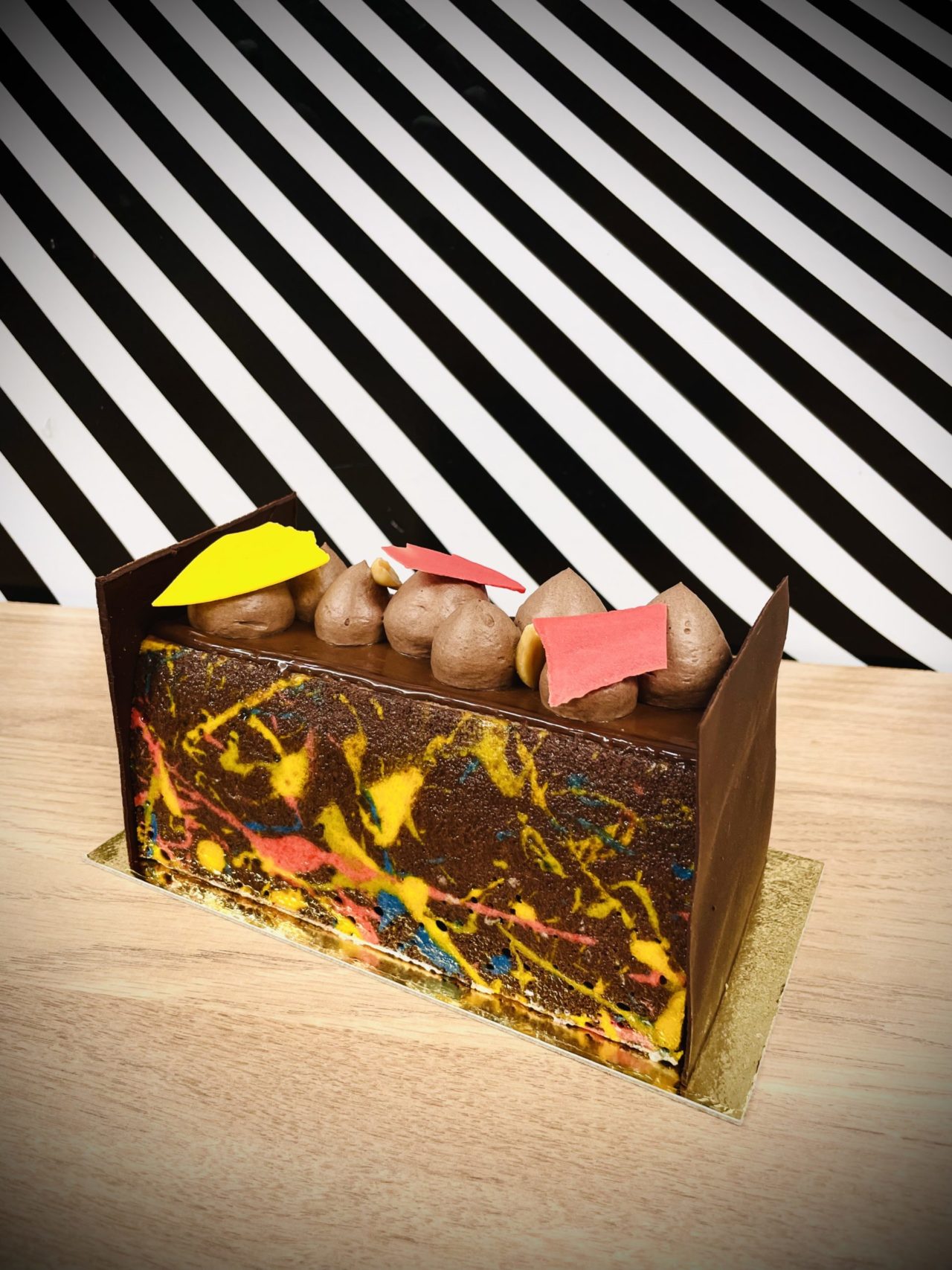 Composée d’une mousse au chocolat noir, d’un crémeux beurre de cacahuète, d’un praliné cacahuète et d’un croustillant cacahuète. L’ensemble habillé d’un biscuit Joconde au chocolat avec des splash de couleur en pâte à cigarette russe.