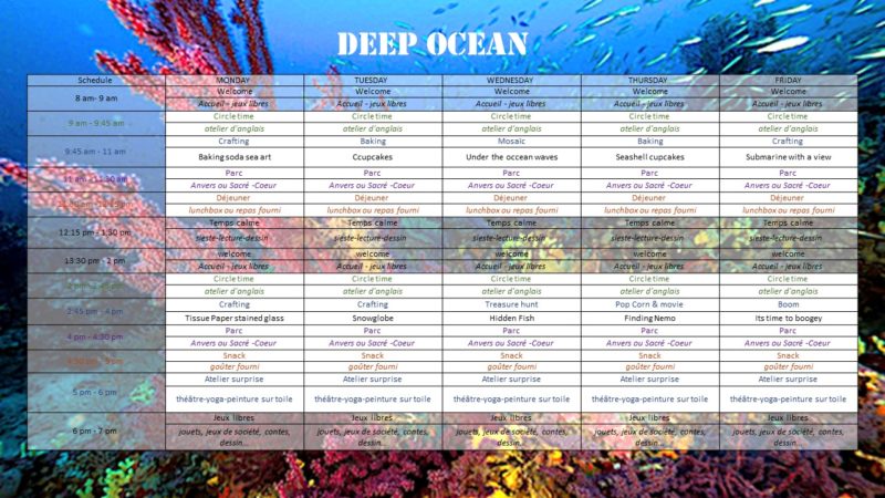 Stage vacance bilingue sur le thème de l’océan. Au programme : des jeux à thème, de la cuisine, des arts plastiques, de la motricité (cirque, yoga kids…) et des cours d’anglais. Pour les enfants de 3 à 9 ans. Montessori Square c’est un programme pédagogique construit, de beaux jouets et matériaux, des supports pédagogiques de qualité, une équipe formée et professionnelle. 1h30 de cours d’anglais (2 groupes de niveau) par jour. Vos enfants sont entre de bonnes mains. Les parents et enfants qui font déjà appel à nous sont conquis! Le goûter est fourni.