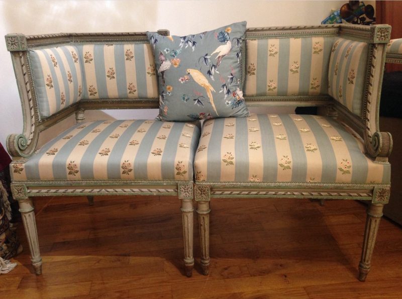 Rendez-vous dans le boudoir de Marie-Antoinette avec cet ensemble de 2 fauteuils d’angle + 1 footstool (ou repose-pied) fin 19e, style Louis XVI, restauré à l’ancienne en bois peint bleu porcelaine. Beau travail vous ne trouvez pas ?