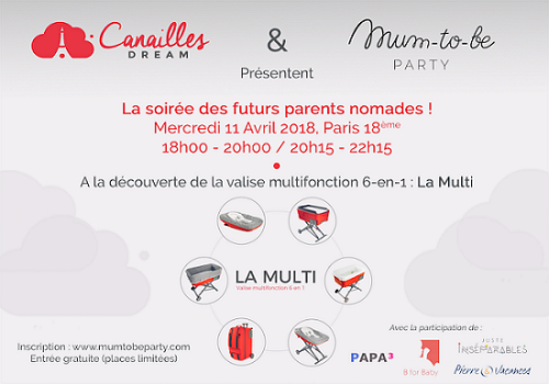 Atelier pédagogique Voyager avec bébé : qui dit voyage avec bébé, dit recours à un maximum d’affaires à transporter… C’est pourquoi le multifonction sera votre meilleur ami ! L’équipe de Canailles Dream vous présentera la Multi, une valise multifonctions innovante, qui, en plus de pouvoir contenir tout le nécessaire de bébé (vêtements, couches, accessoires…) offre 6 fonctions différentes que vous pourrez découvrir au cours de la soirée. Une valise qui révolutionne le quotidien des jeunes parents urbains et actifs ! L’équipe sera accompagnée d’Anaïs, Baby Planner B for Baby, qui partagera les astuces et indispensables pour appréhender les premiers déplacements et voyages avec bébé de manière la plus sereine.