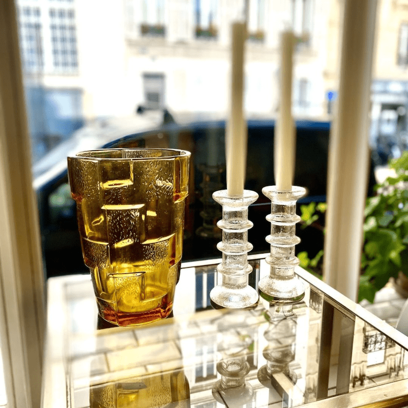 💛 Un vase art déco et une paire de bougeoirs du designer Timo Sarpaneva – pour un joli jeu de transparence