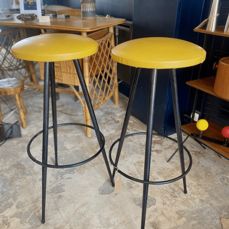 💛 Une paire de tabouret en fer tout droit venus des 70’s à l’assise en sky jaune – pour une touche colorée à tomber