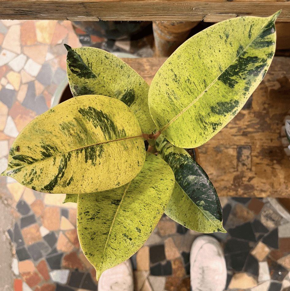 Le Ficus elastica ‘Schrijveriana’ est une variété particulière de l’arbre en caoutchouc, une plante d’intérieur populaire appartenant à la famille des Moraceae. Cette plante se distingue par ses grandes feuilles ovales et panachées, avec des marques blanches ou jaunes crème sur un fond vert foncé. Les feuilles ont une texture lisse et cireuse et sont disposées de manière alternée le long des tiges. Cette variété est appréciée pour son attrait visuel et sa facilité d’entretien.