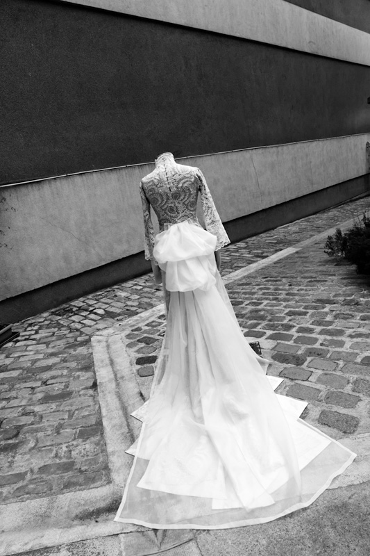 Arrivée avec la robe de mariée toute en guipure de sa maman, Juana souhaitait une continuité tout en créant sa tenue. Le dessin nous a permis de créer un projet de robe. En partant de cette magnifique matière et de la date du mariage : 16 Décembre, j'ai dessiné cette ligne très pure devant avec pour le dos un faux-cul se terminant en traine pour ce moment d'exception !