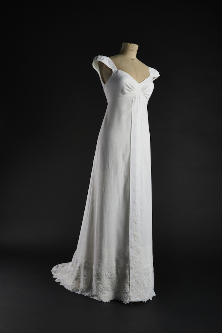 Passionnée par le style empire et les broderies anciennes, Adrienne souhaitait associer ses deux passions. Nous avons chiné ensemble et trouvé une magnifique broderie. Pour cette robe de style empire, la batiste de coton s'imposait pour faire corps avec la broderie, le tout doublé d'une soie très fluide pour garder la légèreté et la sensualité du modèle.