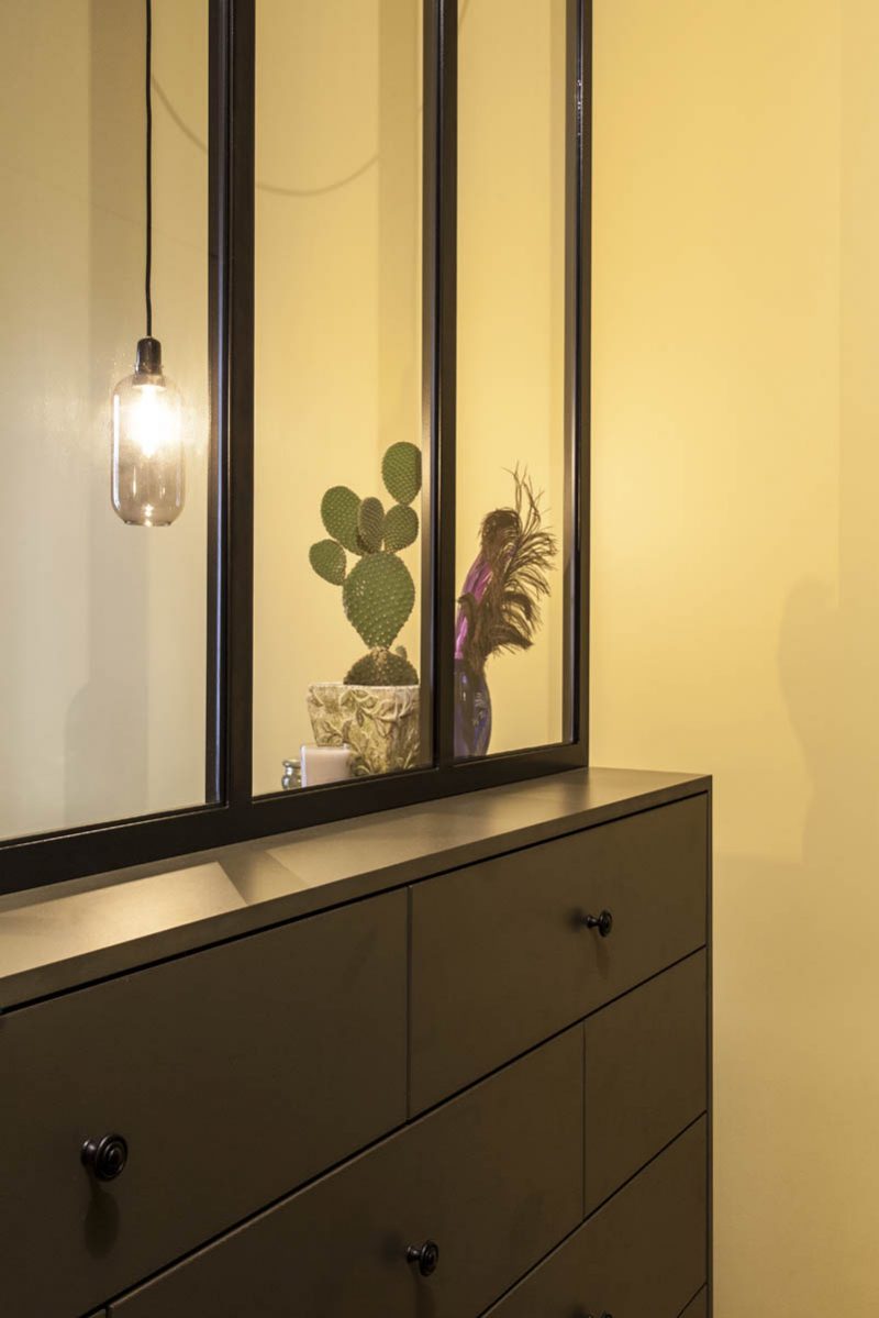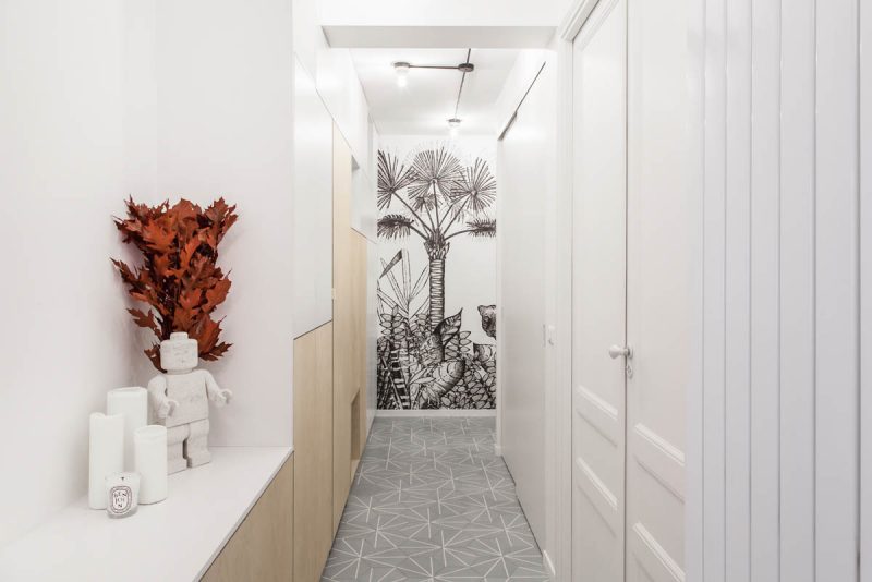 Une des premières volontés était de travailler dès l’entrée de l’appartement. Auparavant très généreuse et même temps ne servant qu’à la distribution, nous lui avons apporté du caractère en lui donnant un rôle de bande servante pour la famille, à la fois très fonctionnelle avec des rangements faits sur mesure pour le quotidien, porte de chambre parentale cachée et fils conducteur par les matériaux pour accéder à la partie privative.