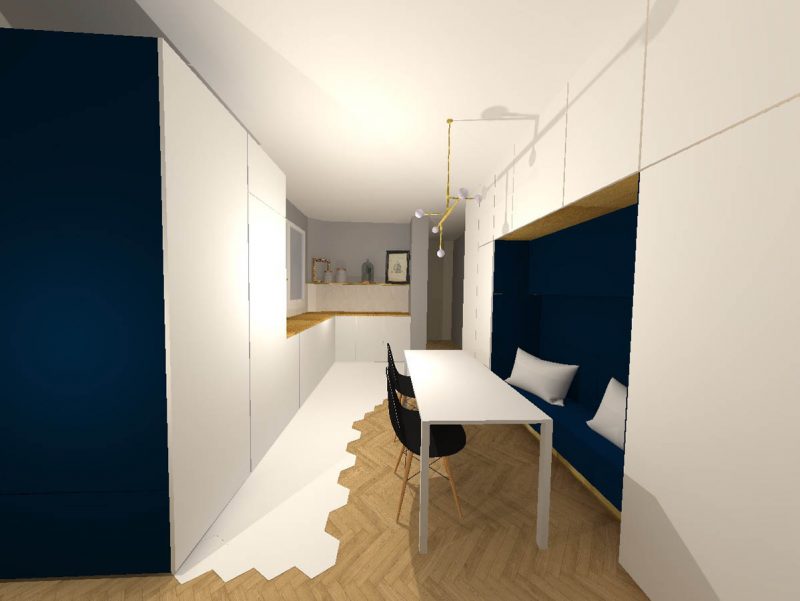 Il fait 107m2. Nous avons décidé de mettre la cuisine au centre de l’appartement, de casser le couloir pour l’y installer.