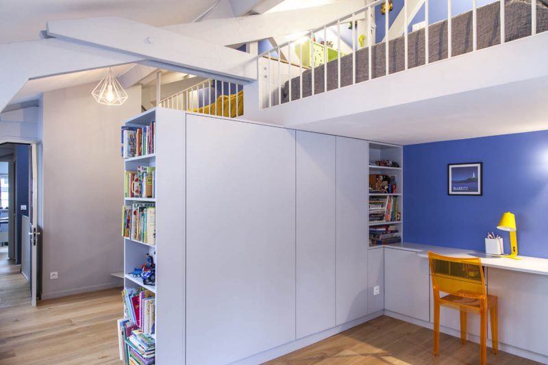 Enfin au dernier étage, nous profitons de la hauteur sous les rampants pour gagner un maximum de place et faire des mezzanines dans les chambres des enfants.