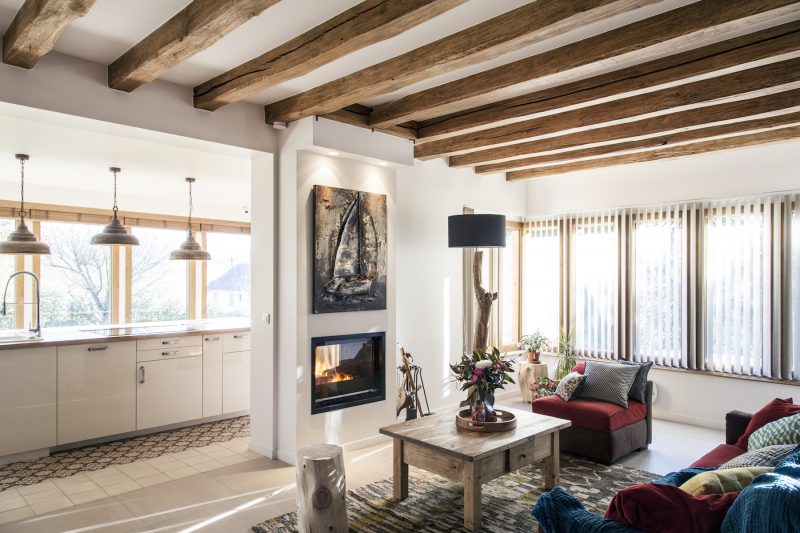 – le mur porteur entre le salon et cette nouvelle cuisine a été ouvert et la cheminée qui s’y trouvait a été transformée en insert double face pour apporter de la chaleur et de la profondeur aux 2 pièces
