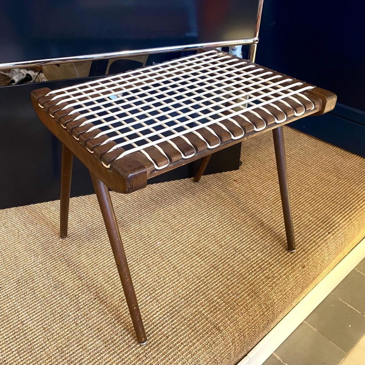 Tout droit venu des années 1960, retrouvez chez Gloria, ce joli tabouret de Georges Tigien de 1960 en teck et fils de scoubidou (oui oui !) ✨