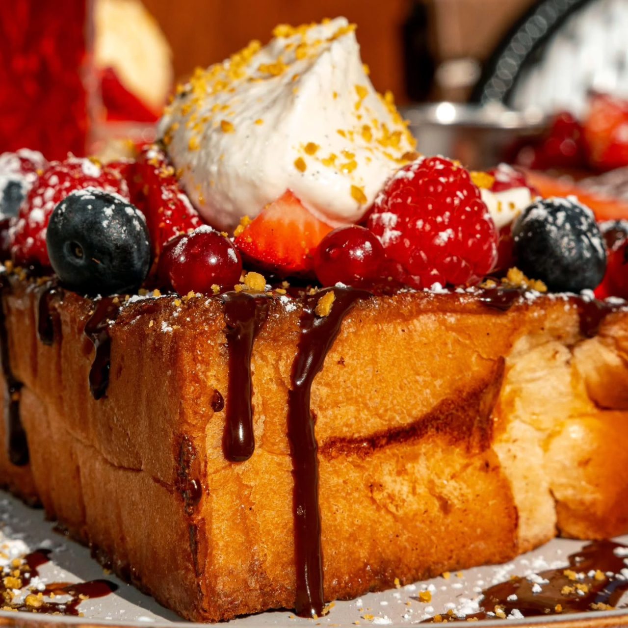 La brioche XL accompagnée de ses fraises, framboises, groseilles, myrtilles, sa sauce chocolat maison et sa crème vanillée maison !!