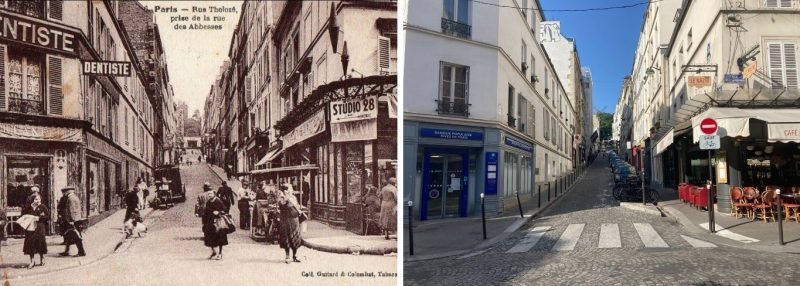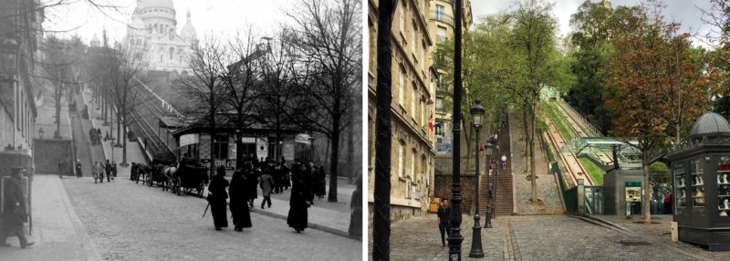 On continue notre balade dans Montmartre à travers le temps, et on s'amuse à jouer au jeu des 7 erreurs ! Si l'ancien réservoir a perdu un étage, la fontaine Wallace de la Place Emile Goudeau n'a pas bougé, l'escalier de la rue Becquerel est toujours aussi raide, et il y a toujours une pharmacie rue Lepic !