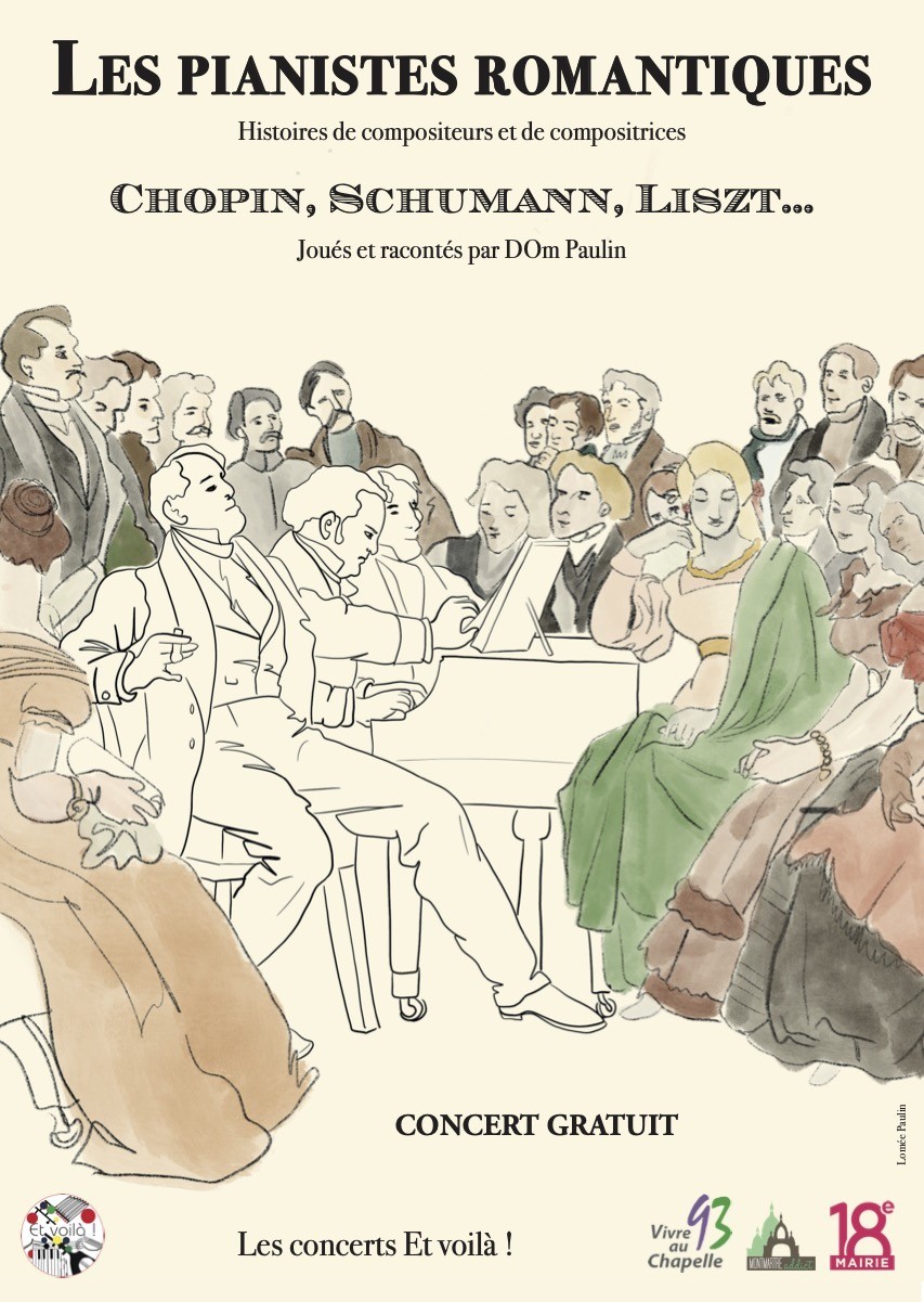 En 1830, Paris ne jure que par ses pianistes : Chopin joue dans les salons privés, Liszt fait des joutes avec Thalberg. À Vienne, Brahms rencontre Robert Schumann et sa femme, Clara, la plus grande pianiste virtuose de l’époque, que Liszt considérait comme son égale. Tous ces pianistes sont à l’origine de ce que l’on a appelé le piano romantique. DOm Paulin vous les joue et vous raconte les épisodes de leurs vies enthousiasmées.