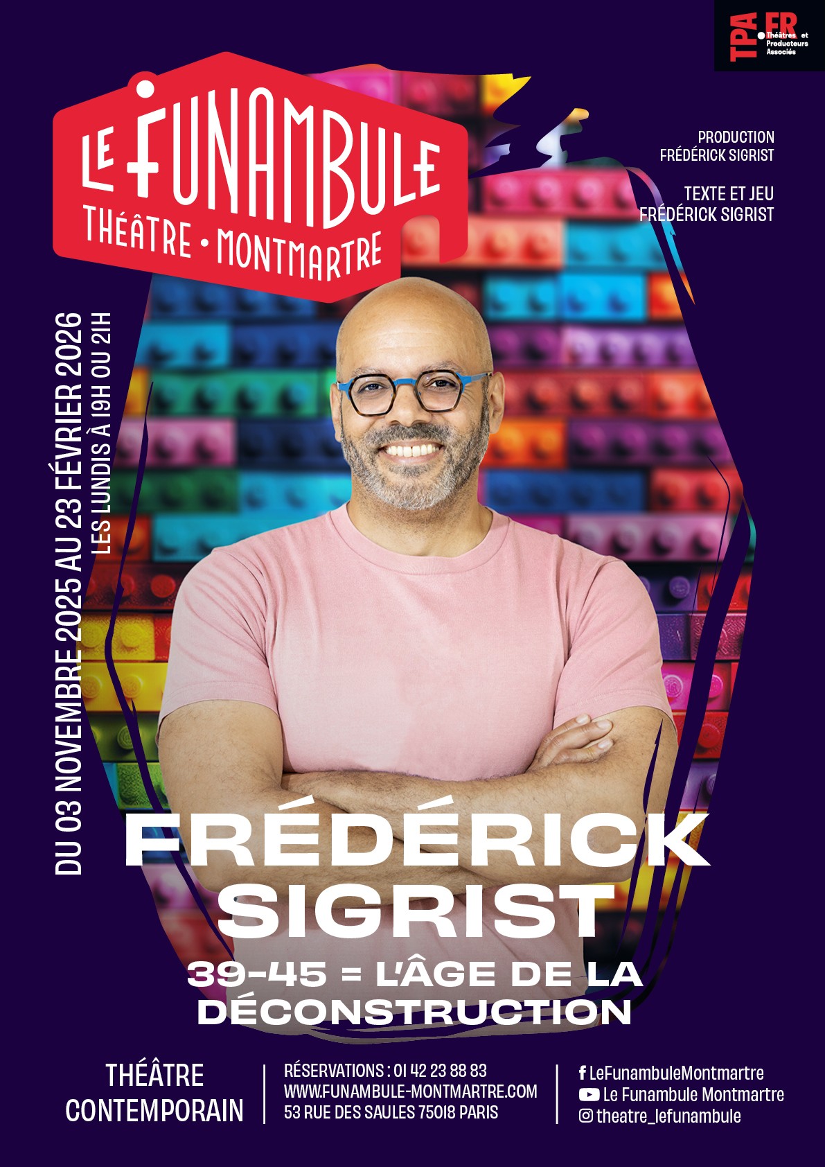 Humoriste à la carrière riche en chroniques radio et télé — France Inter notamment, dont il connaît bien les longs couloirs à moquette — Frédérick Sigrist revient sur la tranche d’âge la plus marquante de sa vie dans son nouveau spectacle : « 39 – 45 », l’âge de la déconstruction. Mais comment se déconstruire si l’on n’a jamais été construit ?