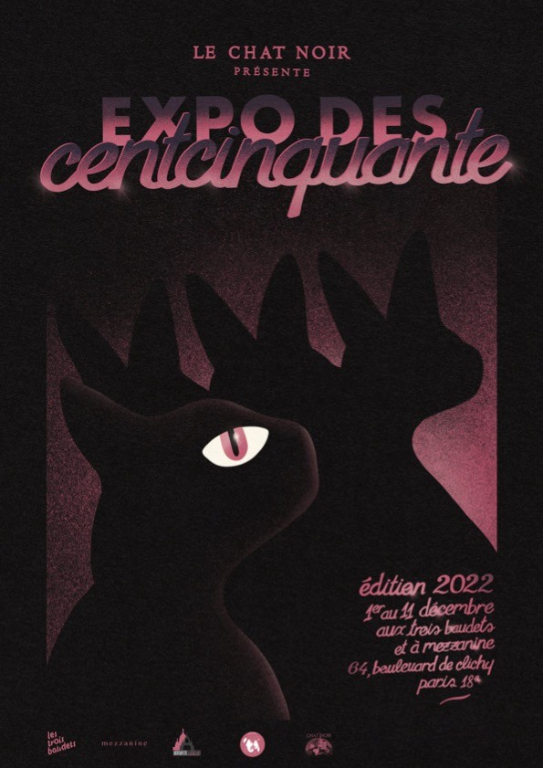 Fière et heureuse que cet appel ait été entendu non seulement des artistes mais aussi par le public, venu très nombreux, l’équipe du CHAT NOIR vous annonce avec joie que l’édition 2022 de L’EXPO DES 150 aura lieu aux TROIS BAUDETS, salle mythique qui a donné naissance à la carrière artistique de nombreux artistes légendaires et à MEZZANINE, nouveau laboratoire créatif et magnifique lieu de fête niché juste au-dessus.