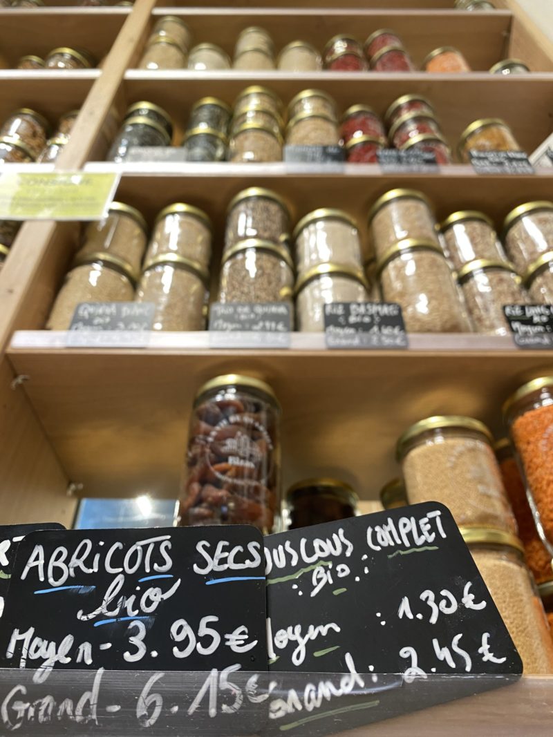 Après avoir fait le plein de vitamines, on se dirige vers les rayonnages de vrac où une multitude de bocaux consignés attendent sagement d’être emportés : fruits secs, légumineux et mélanges singuliers pour l’apéro, il n’y a qu’à lever le bras pour réduire vos déchets. Pour compléter votre panier, vous ne trouverez pas plus d’une ou deux références à chaque fois. Le rayon frais plutôt complet trie sur le volet fromages du terroir, viandes, poissons, charcuterie fine, lait, beurre et yaourts. La cave elle aussi simplifie les choses : une seule bouteille de blanc, de rouge et de rosé vous éviteront de trop longues tergiversations.