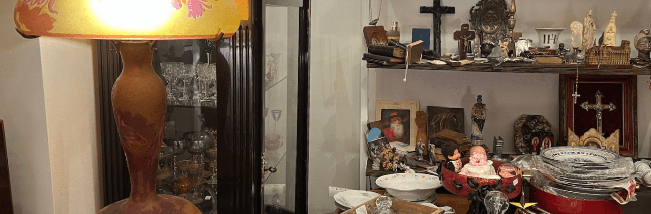 Véritable caverne d’Ali Baba, on trouve ici toute sorte d’objets : des petites boites, des bijoux, des lampes, de la verrerie, des vases, de la vaisselle, des tableaux, des bibelots, et plein d’objets religieux : “Comme on achète souvent en lots, un jour Serge est revenu de salle des ventes avec une grosse caisse de bondieuseries, et on les a très bien vendus. Du coup on continue d’en acheter.” C’est pour la même raison qu’à l’ouverture de la boutique, il y avait plein de cochons, “mais ça on n’en a presque plus !”.