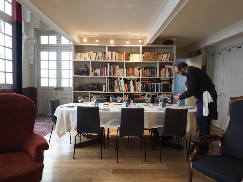 Lorsqu’il visite la maison pour la première fois, c’est le coup de foudre immédiat. Quelque temps plus tard, lorsqu’il décide d’y lancer son activité, il repense entièrement l’aménagement, créant une grande cuisine dans laquelle il voulait absolument une bibliothèque ! Il commence par y donner des cours de cuisine, puis finit par en faire une vraie maison d’hôtes, où l’on peut venir dîner comme si l’on était chez soi, mais où Michel-Antoine s’occupe de tout.